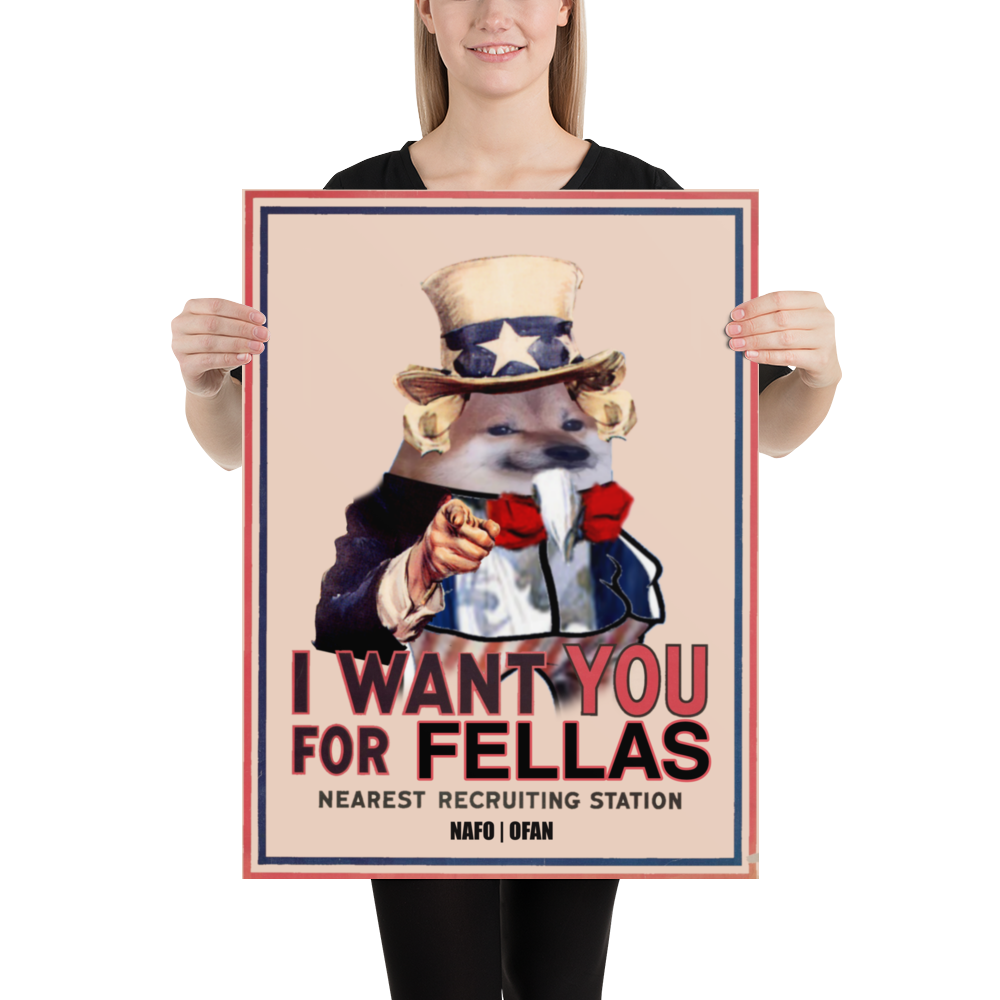 Uncle Sam wants you to join NAFO! This print, inspired by the classic recruiting poster, is the perfect conversation starter and display piece to spread the word about brain-damaged dogs on the internet. Hang it at home, at the office, or anywhere else you can recruit your friends, family, and countrymen to be fellas.