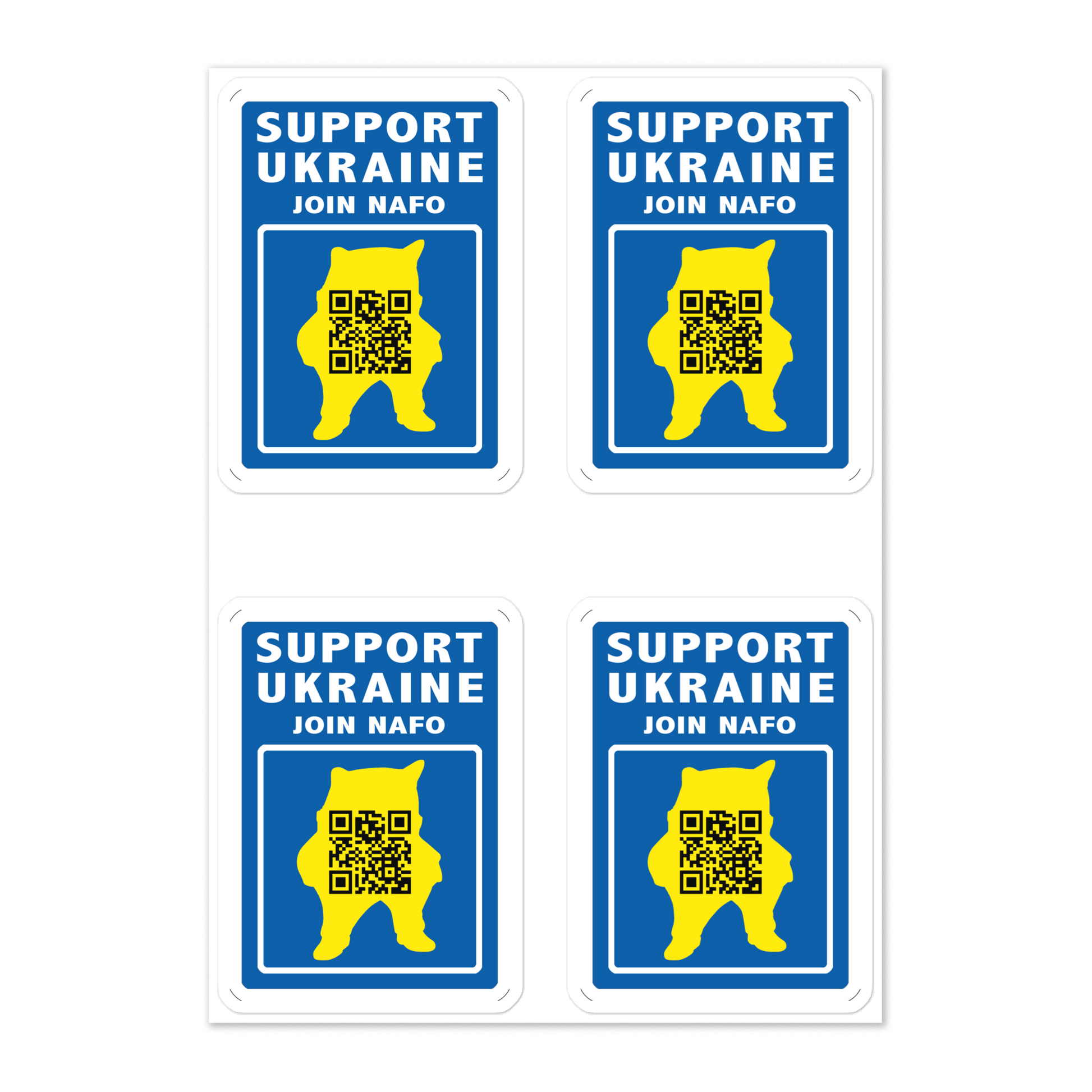 Show your support on the go with this sheet of QR coded fella stickers. The original design, by https://twitter.com/RobEld75 is a perfect way to spread the word of NAFO and to help our Ukrainian friends.